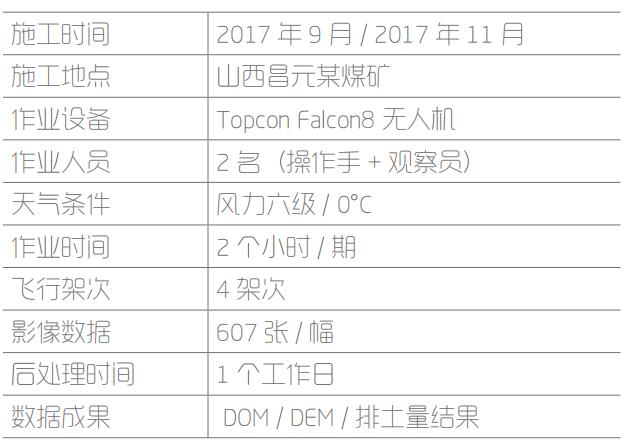 2017 年 9 月,山西某煤业有限公司使用 TOPCON Faclon8 多旋翼无人机对山西某煤矿 2 号排土场进行地形测绘。于 2017 年 11 月进行第二次数据测绘,与原始数据进行排土量的量算。
